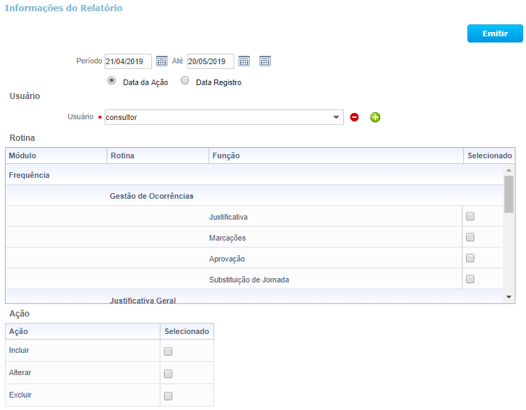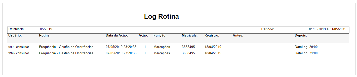 Foi adicionado na tela de Relatórios uma nova opção chamada “Log Rotina” no submenu Gerenciais, onde permite o usuário gerar um relatório das ações feitas pelo usuário para um ou mais colaboradores.