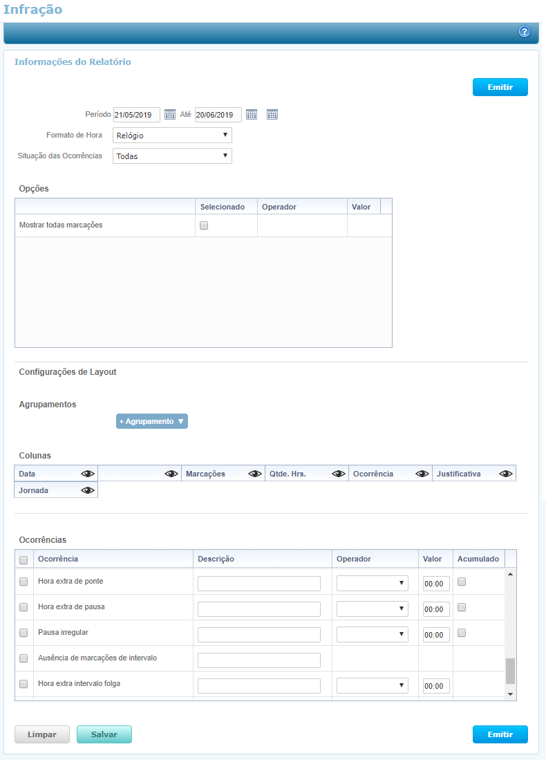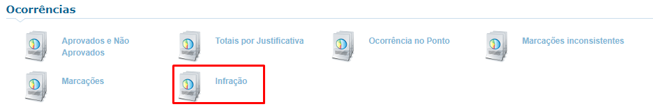 O relatório disponibiliza as seguintes ocorrências para gerar o relatório de infrações: Entrada em atraso; Falta; Hora extra; Hora extra folga; Hora extra folga remu.; Hora extra interjornada; Hora extra de feriado; Hora extra intervalo; Hora extra irregular; Interrupção de jornada; Intervalo irregular; Inconsist. de intervalo; Marcação irregular; Saída antecipada; Sem marcação de entrada; Sem marcação de saída; Hora extra de ponte; Hora extra de pausa; Pausa irregular; Ausência de marcações de intervalo; Hora extra intervalo folga; Interjornada Folga.