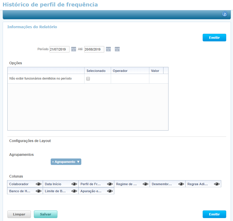 Foi adicionado três novas colunas no relatório Histórico de Perfil de Frequência, sendo elas: Regime de Horas; Desmembramento de Horas; Regras Adicionais.
