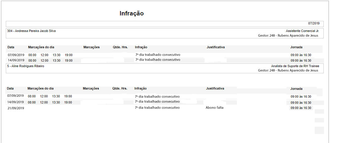 Foi adicionado no relatório de Infração uma nova infração para apresentar os colaboradores que realizaram ou irão realizar uma jornada de trabalho por 7 dias consecutivos, sem realizar sua Folga obrigatória.