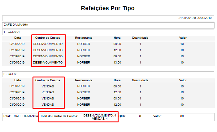Foi adicionado no relatório de Refeição a coluna Centro de Custo e seu totalizador.