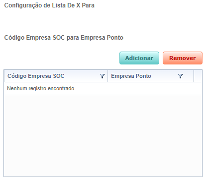 Na Configuração de lista de X para terá os campos para parametrizar o relacionamento entre os códigos de Empresa cadastrados no SOC e no Gen.te Monitora e entre os códigos de justificativas cadastrados no SOC e no Gen.te Monitora. Este relacionamento permitirá realizar uma comparação entre as informações presentes no SOC e no Gen.te Monitora, garantindo a conformidade entre os dois módulos.