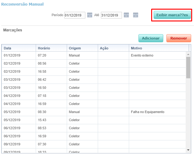 • Marcar opção ‘Exibir marcações’ – Irá carregar exibir automaticamente as marcações do período selecionado do colaborador selecionado no filtro ao acessar a reconversão manual: