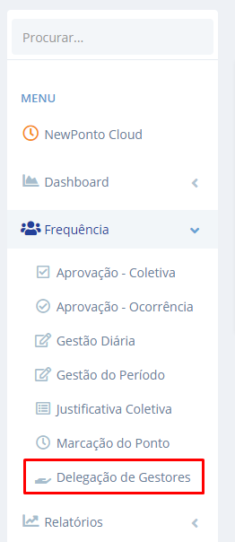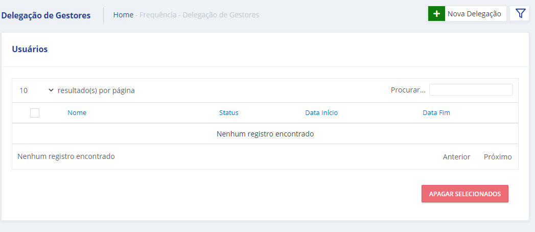 O usuário que receber essa delegação, terá a mesma visibilidade, permissão de frequência e grupos associados ao gestor. Essa delegação ocorre dentro de um período determinado pelo próprio gestor.