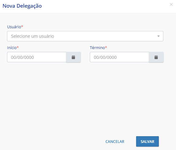Para realizar uma nova delegação, será obrigatório informar os campos Usuário, Início e Termino.