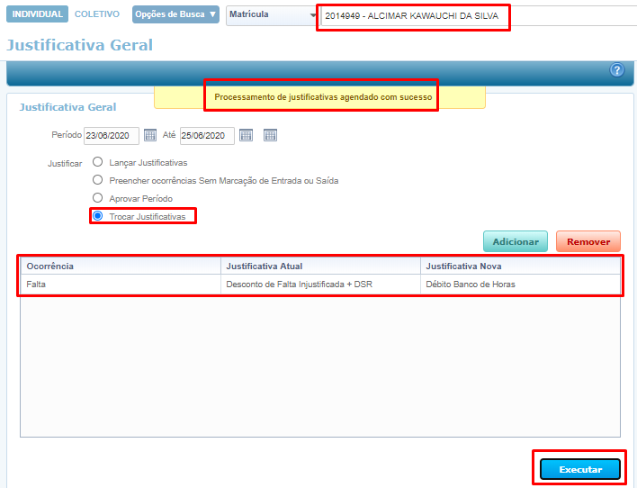 Foi desenvolvido uma nova opção para troca de justificativa em lote chamada: Trocar Justificativas. Possibilita trocar a justificativa de várias ocorrências para vários colaboradores ao mesmo tempo.