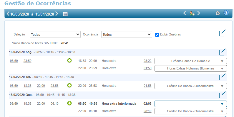 • Resultado: Justificativa Horas Extras Noturnas Blumenau. A ocorrência está inteiramente no período noturno, desta forma vinculou a justificativa parametrizada para a regra “Justificar quando o par estiver no período noturno”.