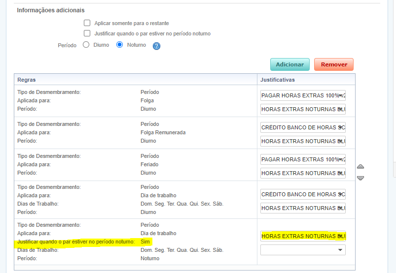 Ao selecionar a opção Justificar quando o par estiver no período noturno, o sistema irá utilizar a justificativa apenas nas ocorrências que se iniciam e terminam no período noturno.