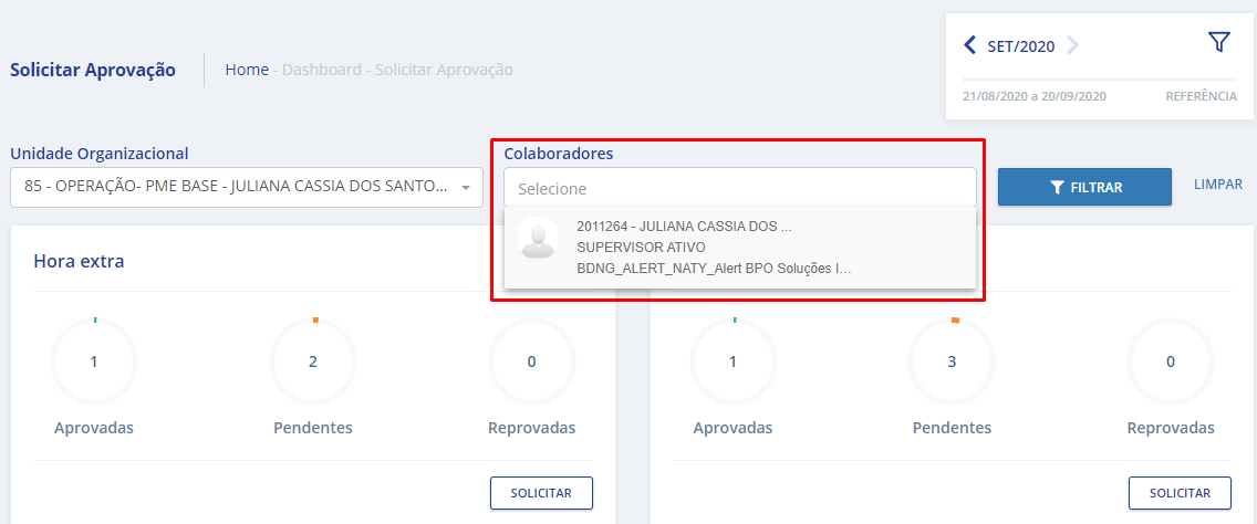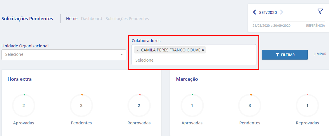 Foi desenvolvido um novo filtro no Autoatendimento para que o usuário consiga visualizar as solicitações pendentes e aprovadas por unidade(s) organizacional ou colaborador(es). Segue abaixo filtros de exemplo: