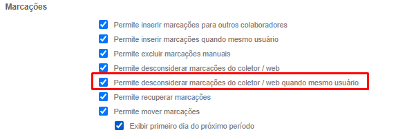 A opção quando habilitada, permitira o colaborador a excluir / desconsiderar marcações dele mesmo, pois a opção não será de uso obrigatório, e o funcionamento atual se manterá caso a opção não seja marcada.