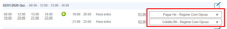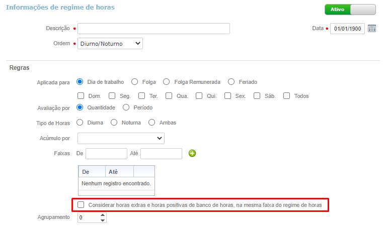 Foi implementado um novo parâmetro chamado “Considerar horas extras e horas positivas de banco de horas, na mesma faixa do regime de horas” no Regime de Horas, para quando houver apuração dos eventos de HE e BH, pode ser considerado tudo na mesma faixa do regime de horas.