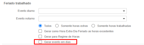 Foi adicionado um novo parâmetro no Perfil de Frequência nas Configurações Gerais na aba Horas Extra, onde permite gerar um evento indicador para feriado trabalhando quando na escala estiver habilitado a opção não verificar feriado. Será gerado um evento em dias contabilizando os feriados trabalhados.