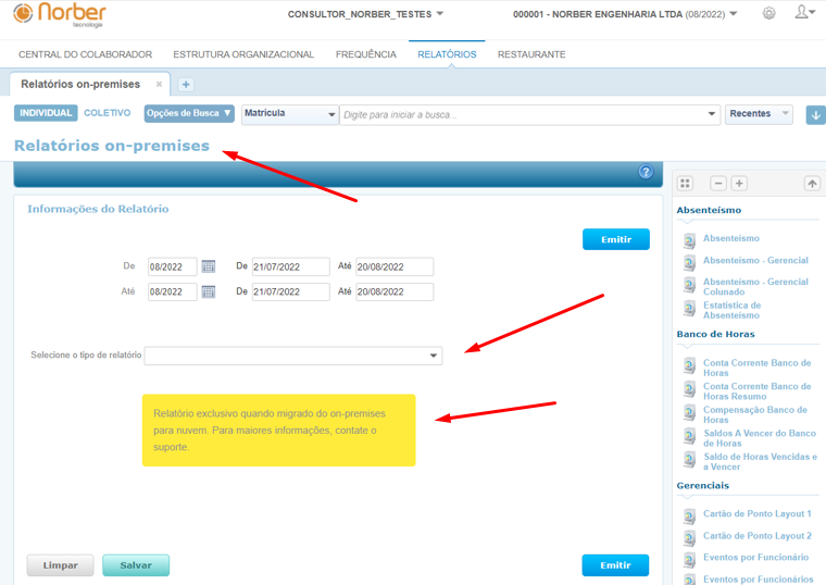Foi desenvolvido um novo relatório chamado Relatórios On-Premises, onde ao emitir os relatórios de Cartão de Ponto, AFDT, ACJEF e Espelho de Ponto da Portaria 1510 e AFD, dos dados que foram processados no oprimisses, para que possam centralizar as informações em um único local para quando for necessário para uma fiscalização, processo trabalhista ou até mesmo auditoria interna.