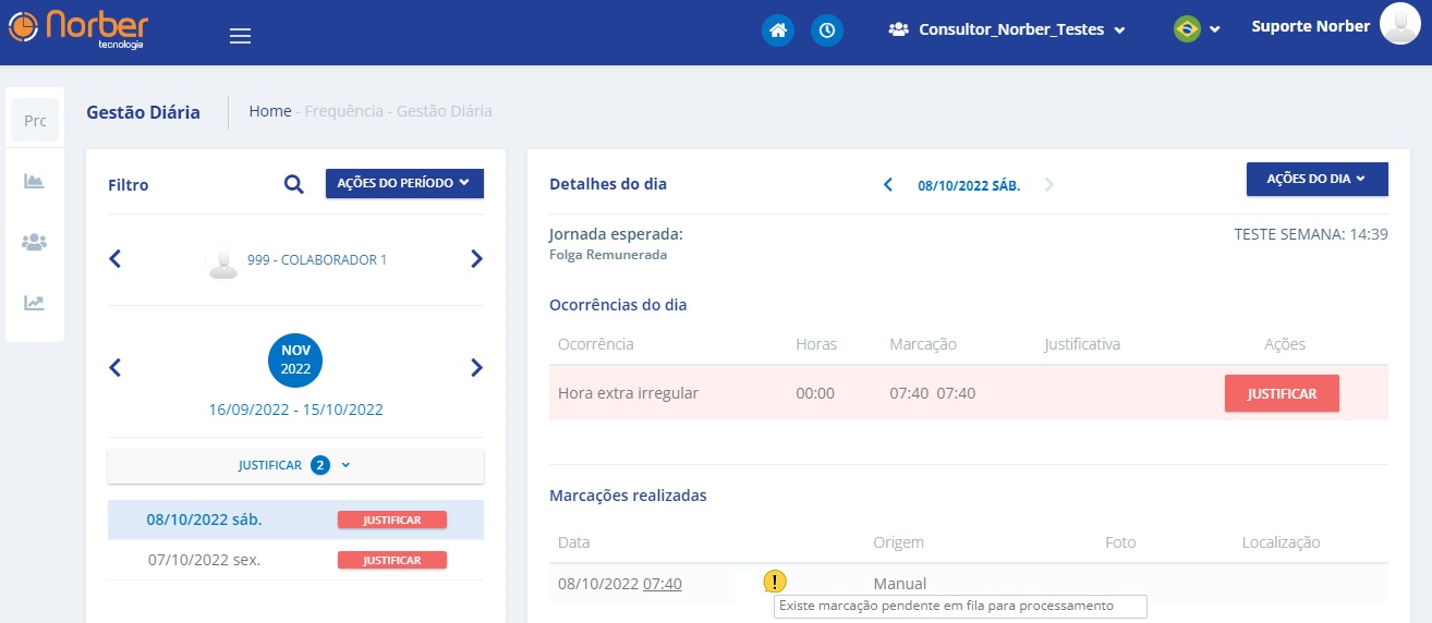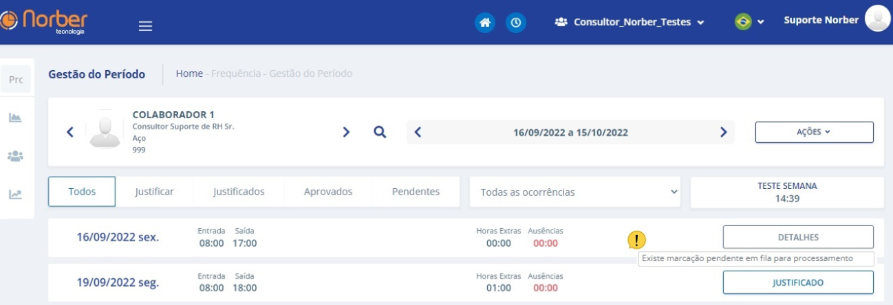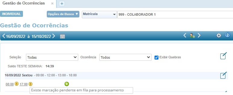 Foi feito uma melhoria nas telas Gestão de ocorrências, Gestão do período e Gestão diária, onde haverá um ícone para identificar quando marcação estiver pendente na fila para processamento.