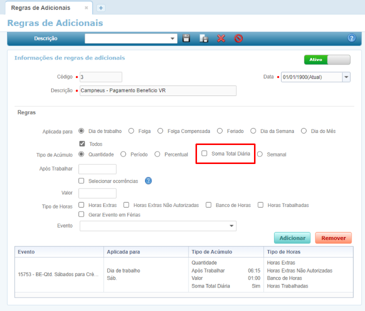 Foi feito uma melhoria nas rotinas de Regras Adicionais, onde será gerado um evento indicador de cálculo de benefício extra para trabalhos aos sábados somente para funcionários que trabalhem mais de 06h15 de jornada total (horas normais e/ou extras).