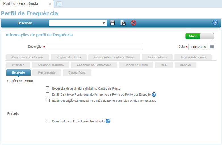 Foi feito uma melhoria na rotina de Perfil de Frequencia, onde haverá uma nova opção na aba de Relatório denominada "Exibir descrição da jornada no cartão de ponto para folga e folga remunerada".
