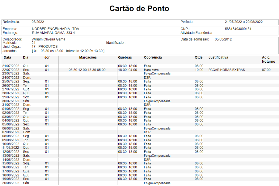 Relatório de Cartão de Ponto: