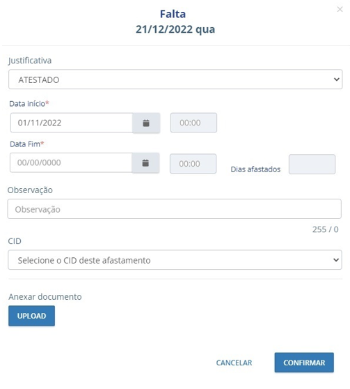 Telas Gestão Diária e Gestão do Período com as novas opções ao selecionar uma justificativa de afastamento: