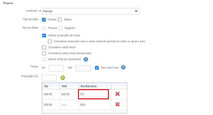 Foi desenvolvido uma nova rotina onde, será possivel permitir a utilização de acréscimo zero na parametrização de proporção de acréscimo por faixa de quantidade de horas no Limite de Banco de Horas.