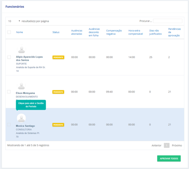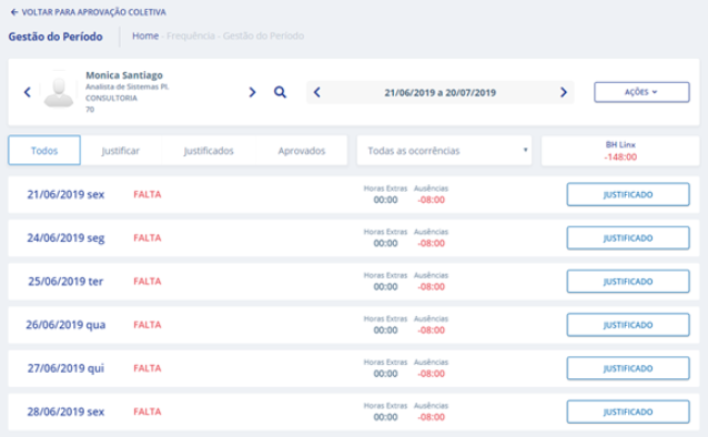 Caso haja necessidade de visualizar o período por completo com todas as ocorrências e justificativas, basta clicar sobre o colaborador que o usuário será direcionado para a tela da Gestão do Período.