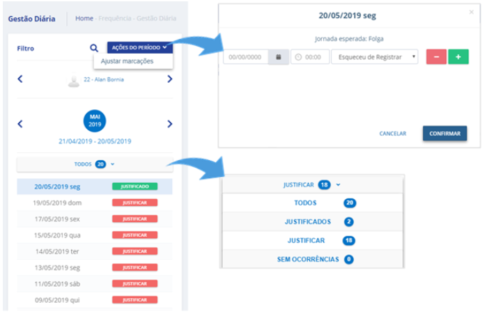 É possível que o usuário realize o ajuste das marcações clicando sobre o botão: Ações do período e ajustar marcações. Será apresentado um modal, o usuário deverá inserir: Data, Hora, Motivo e por fim clicar em Confirmar.