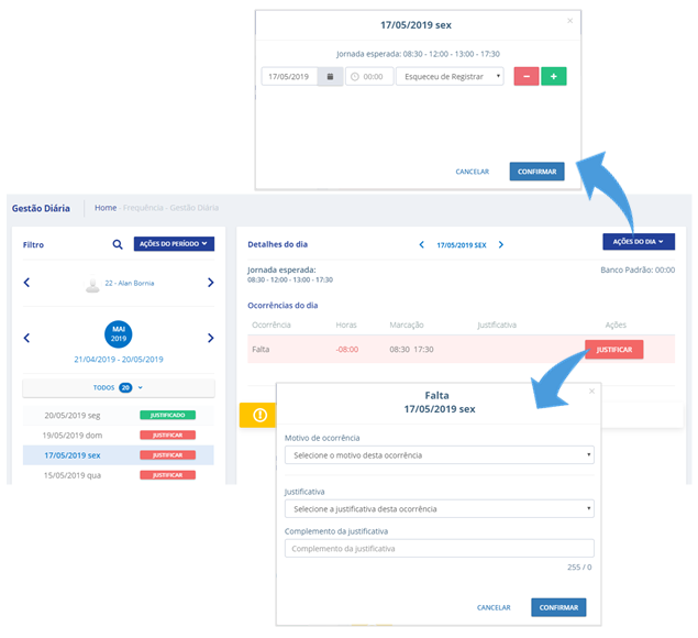 Justificar: será apresentada esta opção em caso de ocorrências que necessitam de justificativa. Ao clicar sobre esta opção, será apresentado um modal com Motivo, Justificativa e Complemento da justificativa. Lembrando que esta opção poderá sofrer alterações conforme a permissão para esta justificativa.