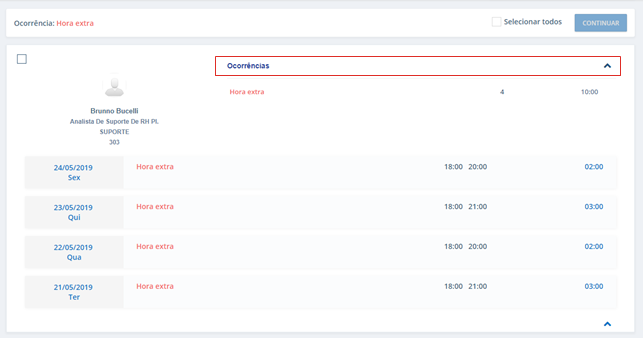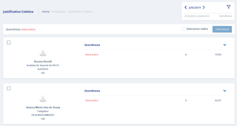Após a execução do filtro, serão apresentados o tipo de ocorrência que foi definido no filtro e os colaboradores.