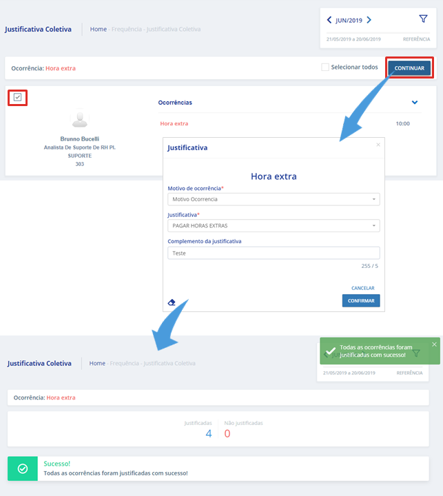 Nesta funcionalidade é possível que o usuário ou gestor justifique o ponto de um ou mais colaboradores, dentro de uma referência ou período determinado.