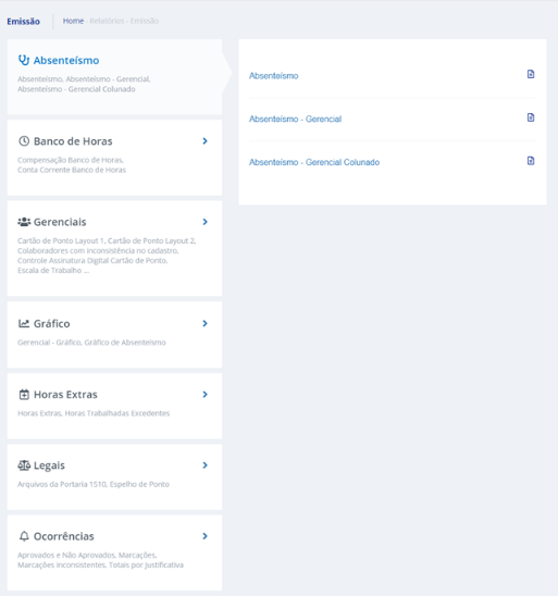 Em emissão, as seções dos relatórios serão distribuídas por blocos, ao selecionar o bloco, uma lista será apresentada com as opções disponíveis para cada bloco. Em cada bloco terá uma legenda para que o usuário saiba quais os relatórios pertencem a ele.
