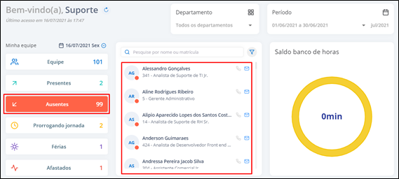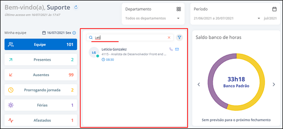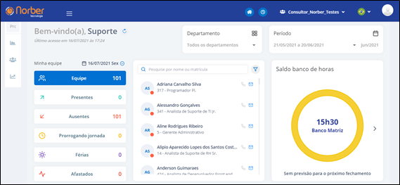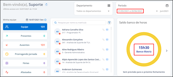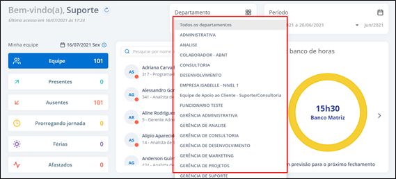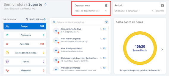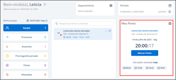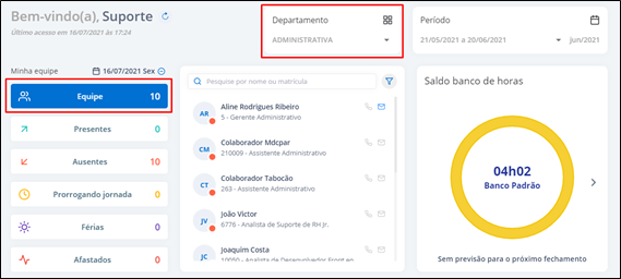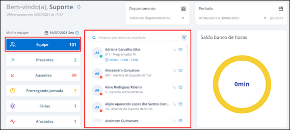 Dentro do novo Home temos o filtro de Minha Equipe que permite filtrar os colaboradores pelos seguintes status: Equipe (todos os colaboradores), Presentes, Ausentes, Prorrogando jornada, Férias e Afastados. De acordo com a seleção dos status é carregado no Dashboard ao lado uma lista dos colaboradores que estão com esse status no momento.