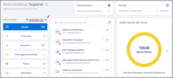 No filtro Minha Equipe temos as opções de ver o dia Atual ou o dia Anterior, abaixo temos um exemplo de como fazer a mudança de um dia para o outro: