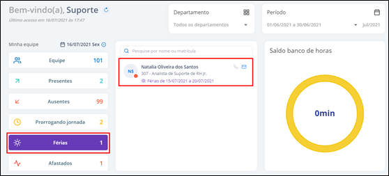 No filtro Minha Equipe temos o Status Férias que permite visualizar todos os colaboradores que estão de férias no dia atual: