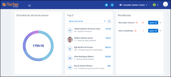 A Norber desenvolveu um novo recurso para o Autoatendimento do NewPonto Cloud chamado Home, esta nova funcionalidade foi desenvolvida com o propósito de facilitar a visão do colaborador ou gestor com informações pertinentes ao status do dia, informações macro de saldo do banco de horas, horas extras, ocorrências, absenteísmo, solicitações de horas extras e marcações e dentre outros recursos. Nela serão apresentadas todas as informações centralizadas em uma única tela com gráficos e filtros para melhor controle.