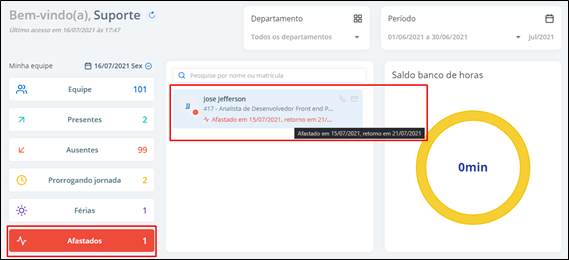No filtro Minha Equipe temos o Status Afastados que permite visualizar todos os colaboradores que estão afastados no dia atual:
