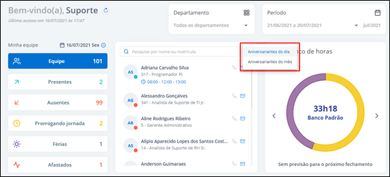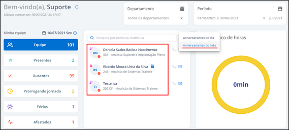 No filtro Aniversários do Mês quando selecionado irá exibir todos os colaboradores que fazem aniversário no mês atual: