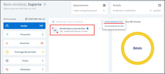 No filtro Aniversários do Dia quando selecionado irá exibir todos os colaboradores que fazem aniversário no dia atual: