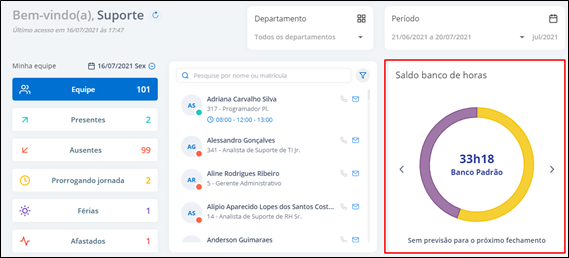Exemplo Saldo Banco de Horas total (foi selecionado toda equipe):