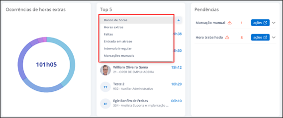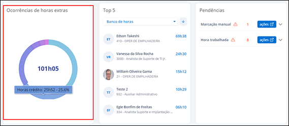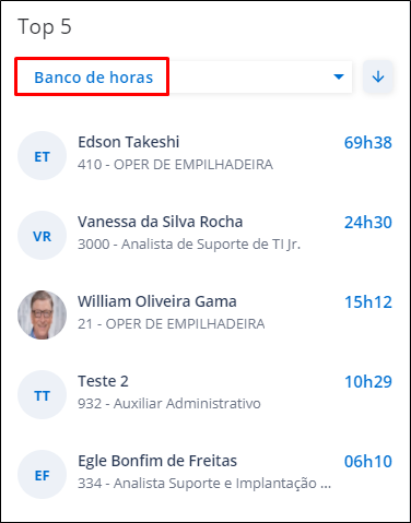 No filtro do Top 5 temos a opção Banco de Horas que permite visualizar os 5 colaboradores que mais tem horas no banco de horas, abaixo temos um exemplo: