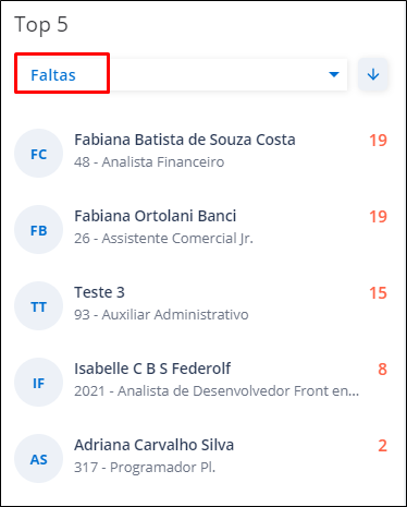 No filtro do Top 5 temos a opção Faltas que permite visualizar os 5 colaboradores que mais tem faltas no período, abaixo temos um exemplo: