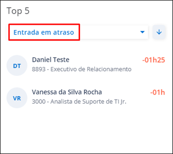 No filtro do Top 5 temos a opção Entrada em Atraso que permite visualizar os 5 colaboradores com mais horas em atraso na entrada, abaixo temos um exemplo: