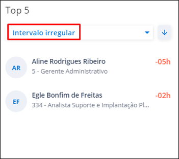 No filtro do Top 5 temos a opção Intervalo Irregular que permite visualizar os 5 colaboradores com mais horas de intervalo irregular, abaixo temos um exemplo: