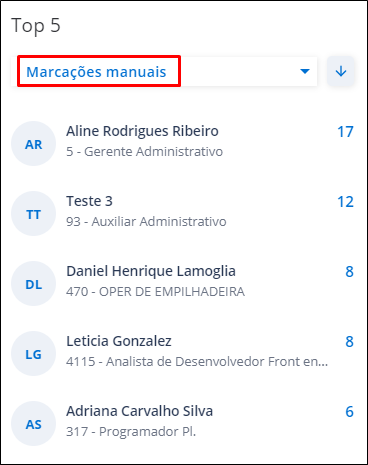 No filtro do Top 5 temos a opção Marcações Manuais que permite visualizar os 5 colaboradores com mais marcações manuais no período, abaixo temos um exemplo: