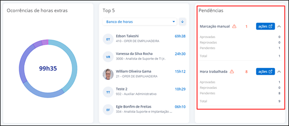 Exemplo das pendências de aprovação de horas extras e marcações: