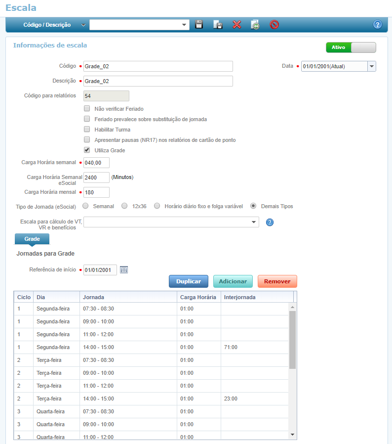 Foi adicionado na tela de Escalas uma nova opção chamada “Utiliza Grade”, onde ao habilitar está opção será exibido uma nova aba Grade onde permitirá o usuário informar as jornadas que irão compor a escala da grade.