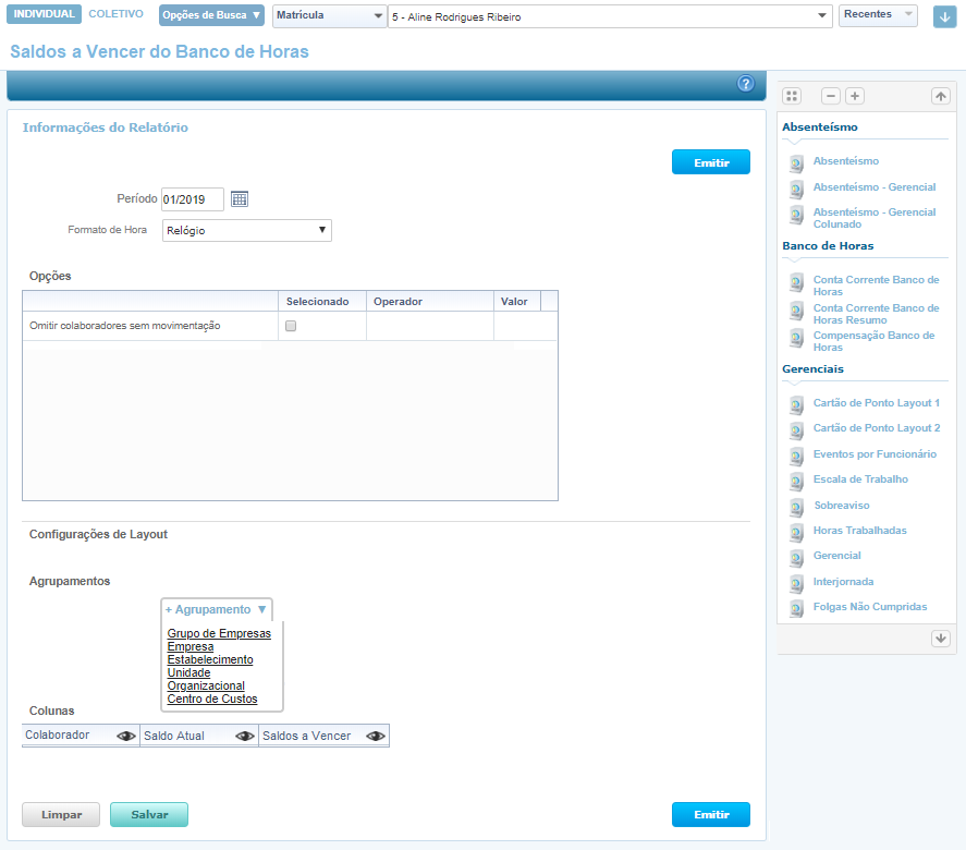 Foi adicionado na tela de Relatórios um novo relatório chamado Saldos a Vencer do Banco de Horas, onde é possível visualizar as horas a vencer do banco de horas de cada colaborador por mês.