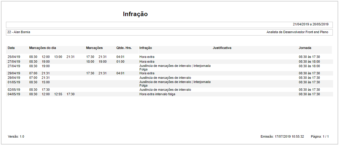 Foi adicionado na tela de Relatórios um novo relatório chamado “Infração”, onde permite o usuário gerar um relatório com as infrações feitas pelo colaborador.