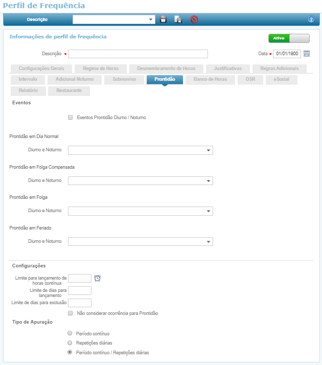 Período Contínuo: Ao selecionar esta opção o sistema irá considerar a apuração das horas de Prontidão sem interrupção para o período cadastrado, contabilizando do horário inicial do dia inicial até o horário final do dia final cadastrado.
