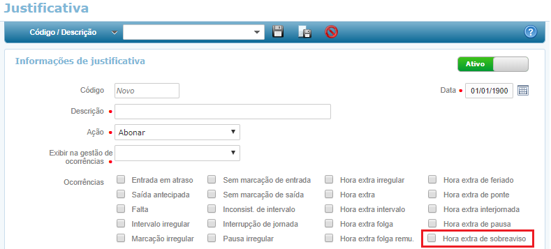 Foi adicionado um novo checkbox no cadastro de Justificativa chamado: Hora Extra de Sobreaviso, está nova opção permitirá o acionamento direito das horas de sobreaviso para pagamento.