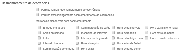 Foram adicionados novos parâmetros na Permissão de Frequência, onde será definido se o usuário poderá desmembrar ou não as ocorrências e quais ocorrências poderão ser desmembradas.
