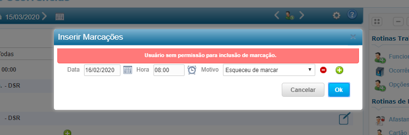Desmarcado: O sistema não permitirá o usuário incluir/excluir marcação exibindo a seguinte mensagem: Usuário sem permissão para inclusão de marcação.